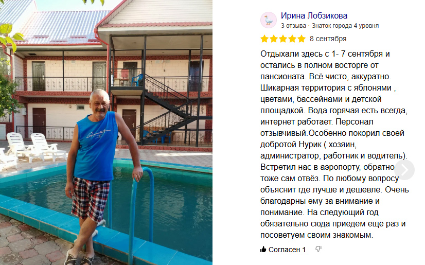 В пансионате есть всё для приятного отдыха : номера уютные, и удобные, столовая с разнообразным меню (как европейские так и местные национальные блюда), большая территория с бассейном. Очень удивил и порадовал подход, начиная от архитектурной композиции здания (корпуса расположены по периметру всей территории, что обеспечивает защиту не только от посторонних, но и от неблагоприятных климатических условий) и цветовых решений уютных номеров и заканчивая большим вниманием к детям, что очень важно, т.к. многие отдыхают с детьми (это мини-горка, надувные игрушки и.т.д.). Большое спасибо от наших детишек вам. Про бассейн я вообще не говорю - это редкость в мини-пансионатах. Отдельное спасибо хотелось сказать персоналу пансионата, очень радушные, милые. Чувствуешь себя как в большой семье. Большое спасибо поваром за старания, за вкусные блюда – молодцы. И, конечно же, спасибо Джамиле, которая так умело управляет делами пансионата. Очень было приятно отдыхать здесь, обязательно приедем еще и всем друзьям и знакомым посоветуем остановиться у вас.